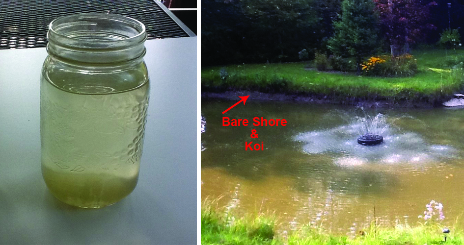 Murky pond water, Muddy pond water, Cloudy pond water ...All of these problems have one common denominator, high turbidity. Turbidity is caused by suspended inorganic and/or organic particles that cause cloudy or murky water. There are different levels of turbidity too. The more floating particles, the more turbid and the cloudier the water.